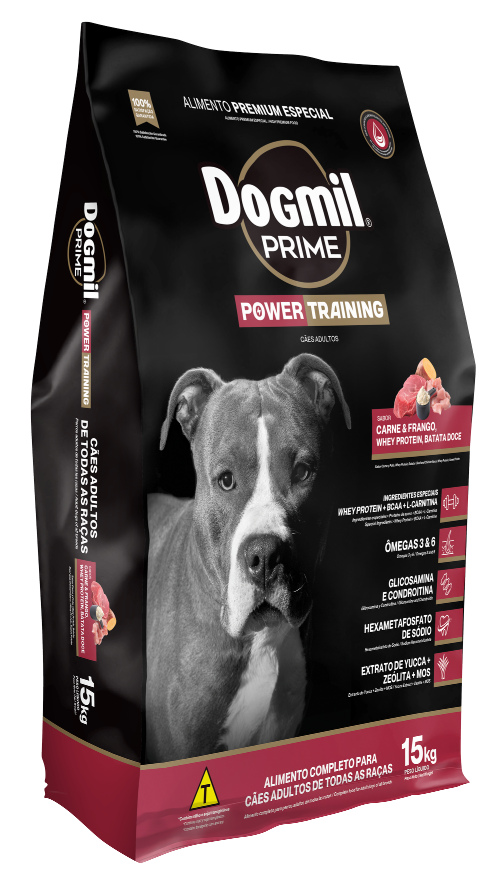Dogmil Prime® POWER TRAINING Cães Adultos é especialmente indicado para cães com níveis moderados a intensos de atividade física e/ou treinamento. Com ingredientes especiais que proporcionam maior disponibilidade e reposição de Energia, e componentes que aceleram a síntese protéica e a recuperação após o exercício.
